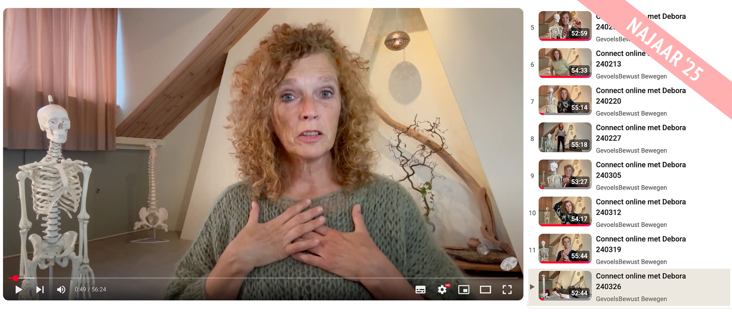 Debora neemt je iedere online les mee in de oefeningen van het GevoelsBewust Bewegen. Speels en nieuwsgierig duiken we het lichaam in. Ons hoofd is gewend om simpele dingen ingewikkeld te maken, dat hoeft even niet. We gaan weer terug naar ons oorspronkelijk voelbewustzijn, onze lichaamswijsheid. We onderzoeken de bewegingen die bij ons dagelijks leven horen. Je hebt je lijf nodig en soms een stoel of soms een matrasje. Soepele kleding is ook een aanrader.